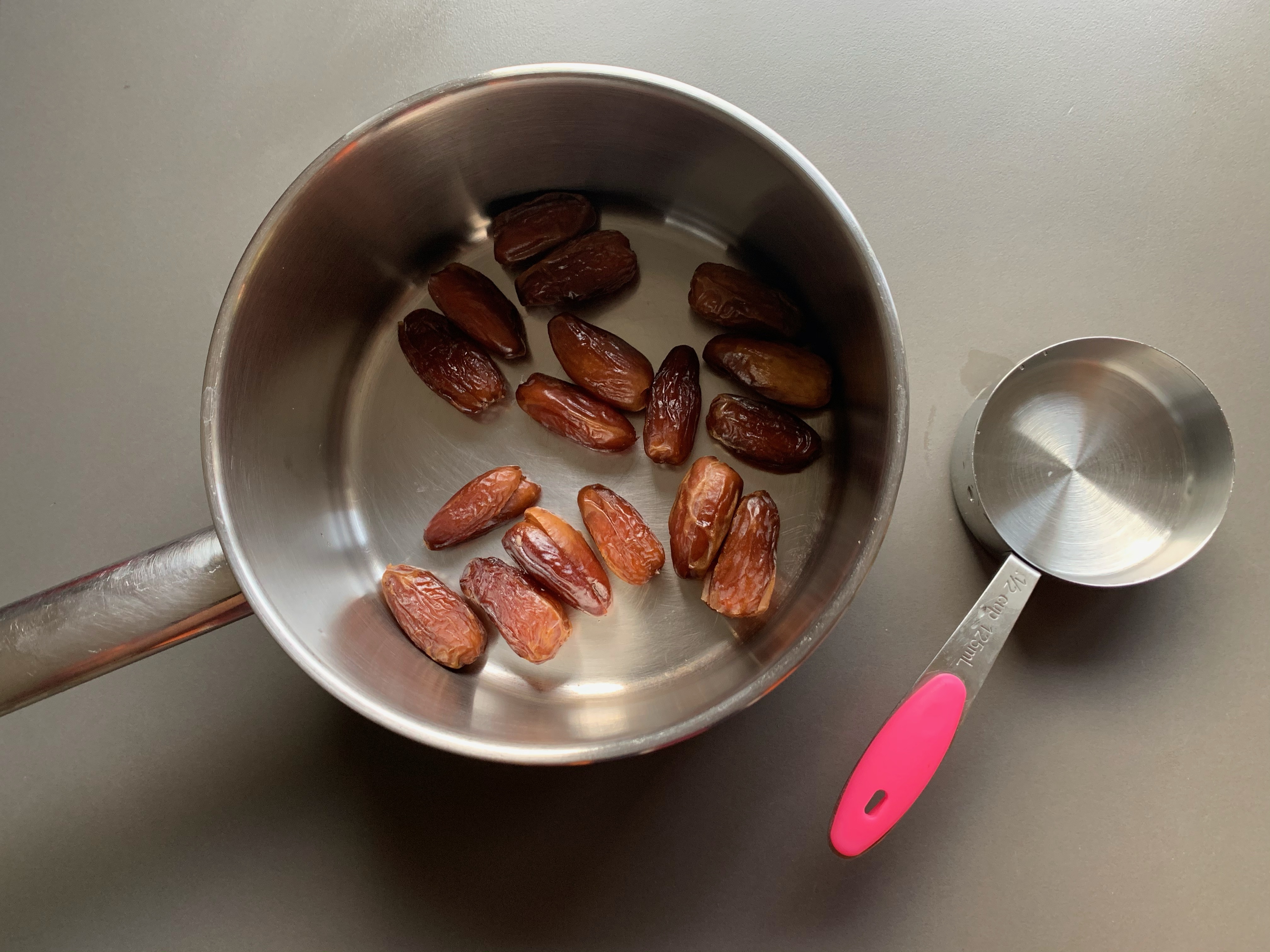 - Put the dates in a sauce pan and add 1/2 cup of water.