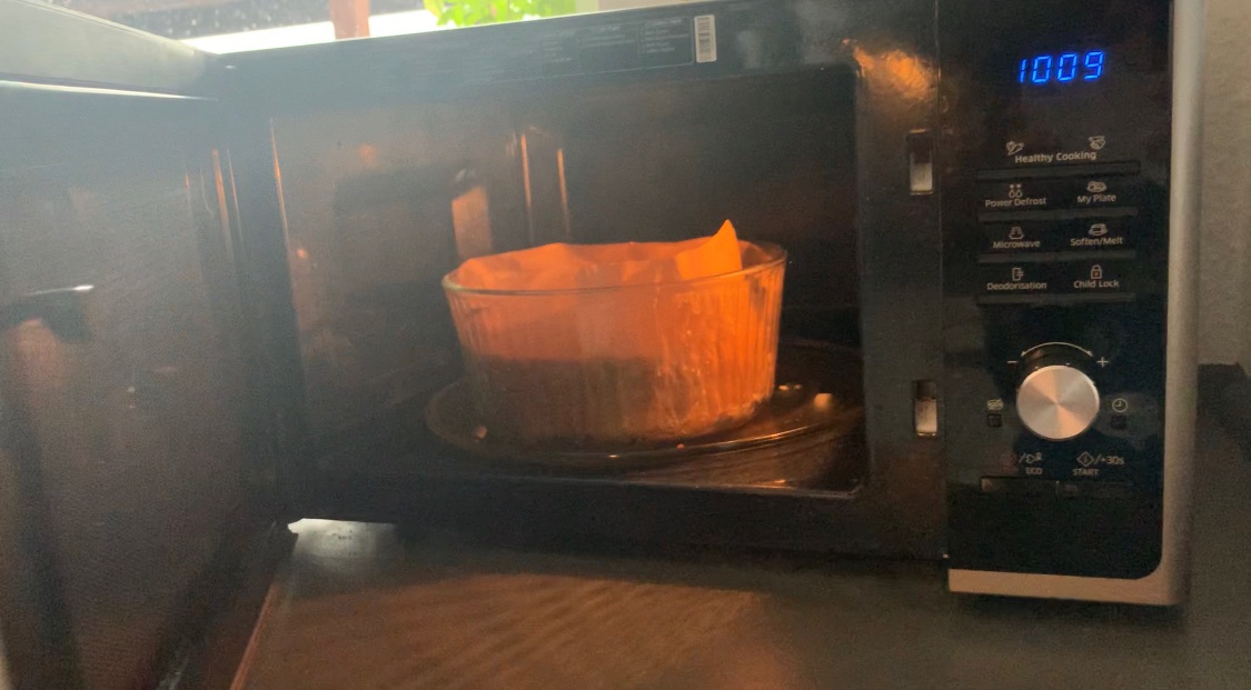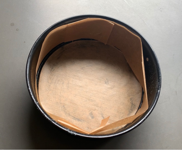 - Line your baking tin/ microwave safe glass bowl with parchment paper on the bottom and on the side. Cut into a circle to cover the bottom, and cut into strips to cover the sides. Spread some ghee/butter to facilitate the parchment paper sticking to the tin/bowl.