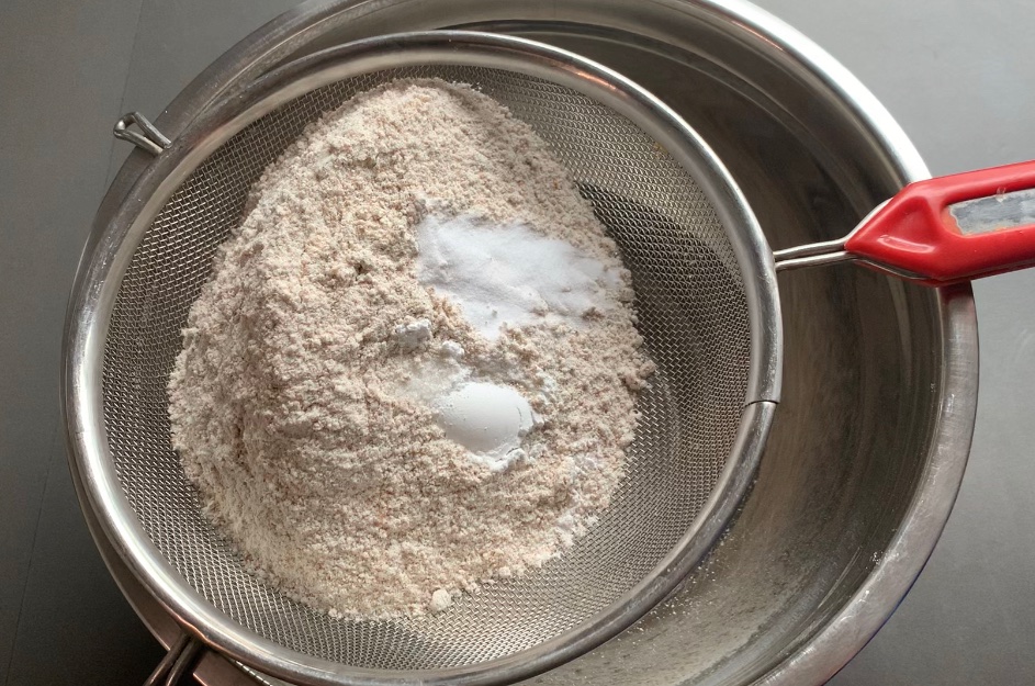 - Take a big sieve and add flour, baking powder, baking soda and salt into it. Sift it together into a bowl to make your dry mixture. Set aside.