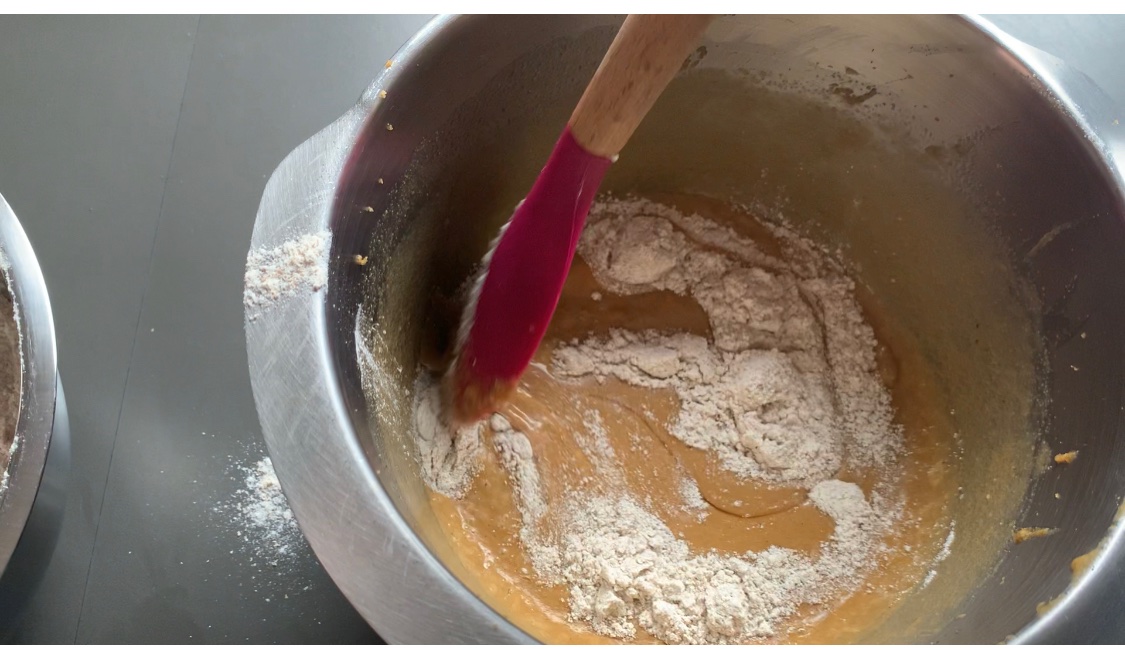 - Add in the dry mixture, a little at a time and carefully fold it in. Do not mix rigorously as it will break the air bubbles and your cake will become dense.