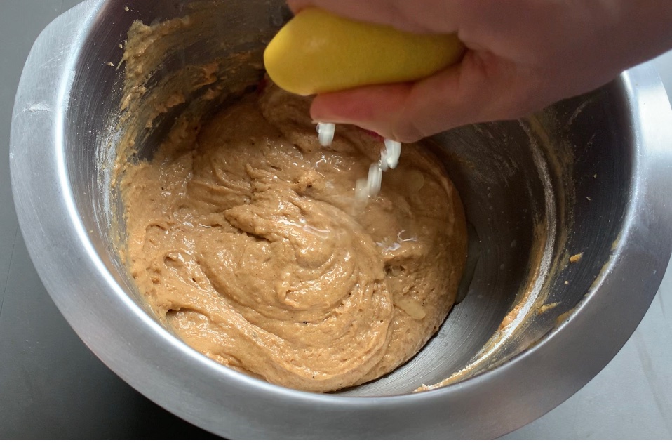 - When the batter is evenly mixed, add the lemon juice. Mix just until combined and transfer quickly to the lined tin/ glass bowl.