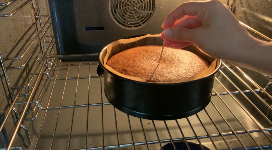 - Because of the whole wheat and raw sugar, this sponge cake gets dark in color while baking. Do not confuse the dark color with burning. The cake is done when a toothpick inserted in the middle comes out clean.