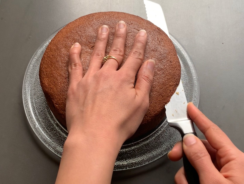 - Carefully cut off the top layer of the cake in a straight and even layer.
