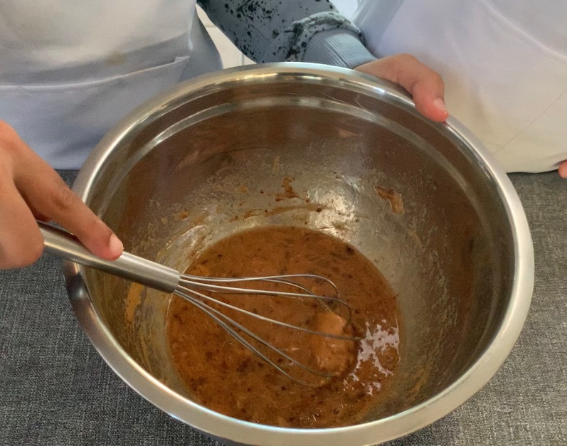 - Add eggs, peanut butter, maple syrup, cinnamon powder and salt to the mixing bowl. Mix them together using a whisk until everything is well combined, and a smooth mixture is formed.