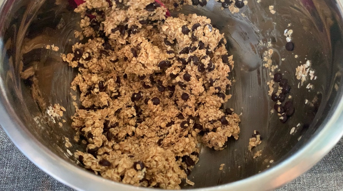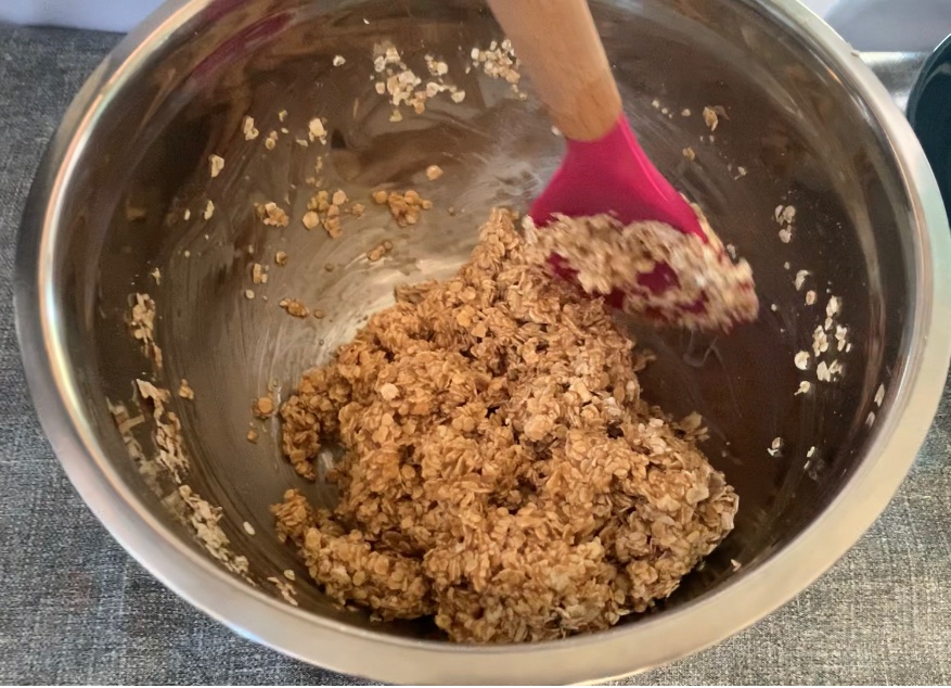 - Add the oats and mix with a spatula. The oats will slowly absorb the liquid. Mix until well combined.