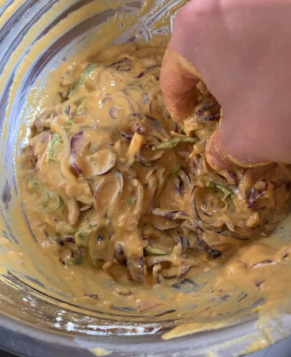 You need a base for the flour to stick onto, and for the pakoras to retain their shape. I have tried to use cupcake moulds to pour my batter in and make the pakoras without using onion, but I didn’t like the results. They were dense and soggy and took way too long to cook.