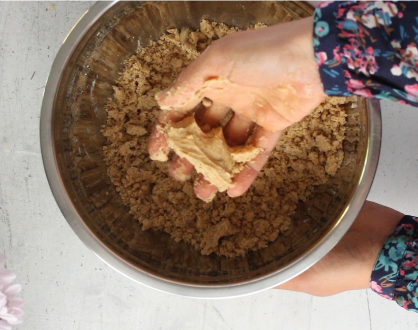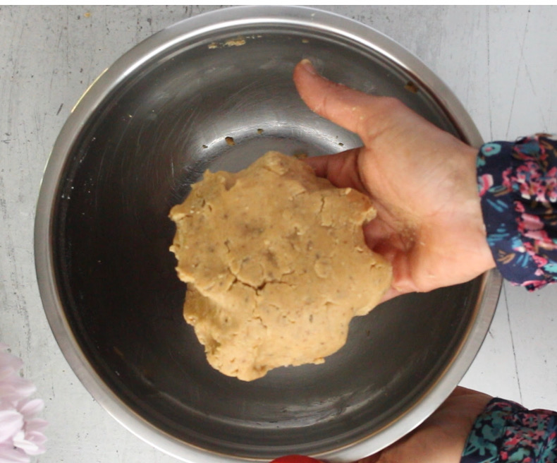 - Add all the ingredients, except water in a big bowl. Break the butter with hands and rub it into the flour. Mix everything until the flour is well incorporated. Press it between your fist and the dough should stick together.
