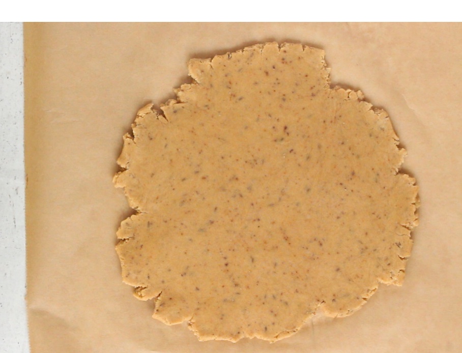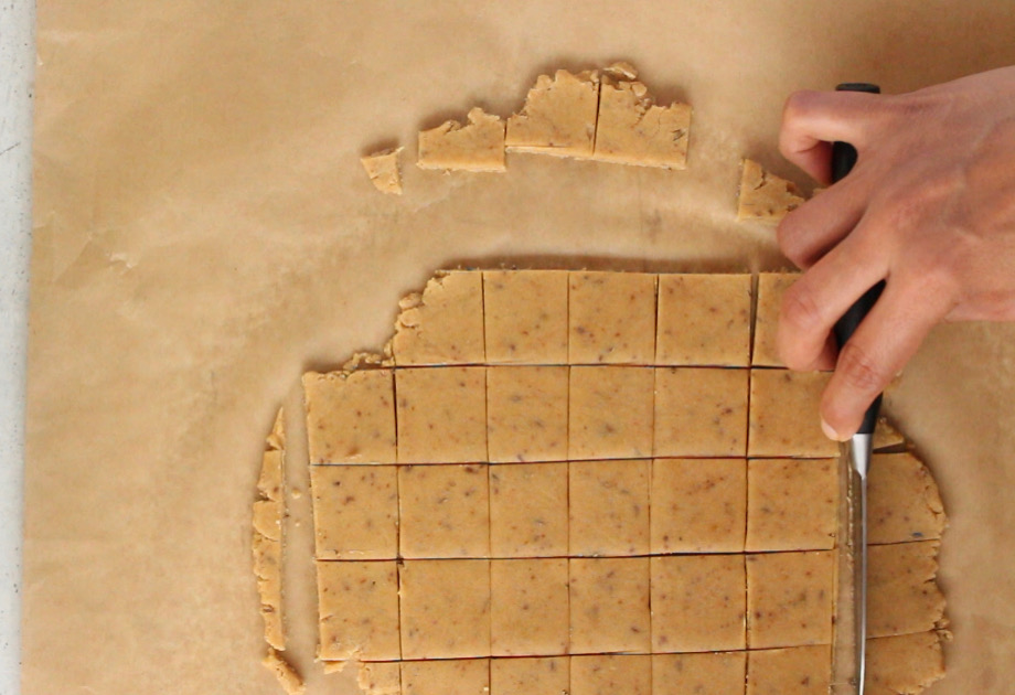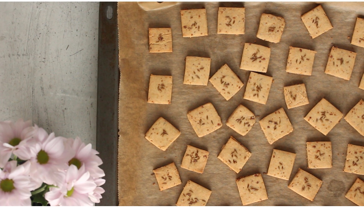 - Cut similar sized squares about 3×3 cm using a knife. Transfer to a lined baking sheet. Sprinkle some cumin seeds on top of each cookie and press lightly to secure it in place.