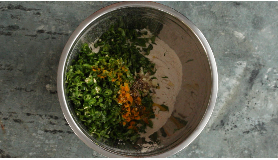 - In a big bowl add the flour, chopped methi, green chili and garlic, turmeric powder, cumin seeds, 1 Tbsp olive oil and salt. Mix with hand to bring the ingredients together.