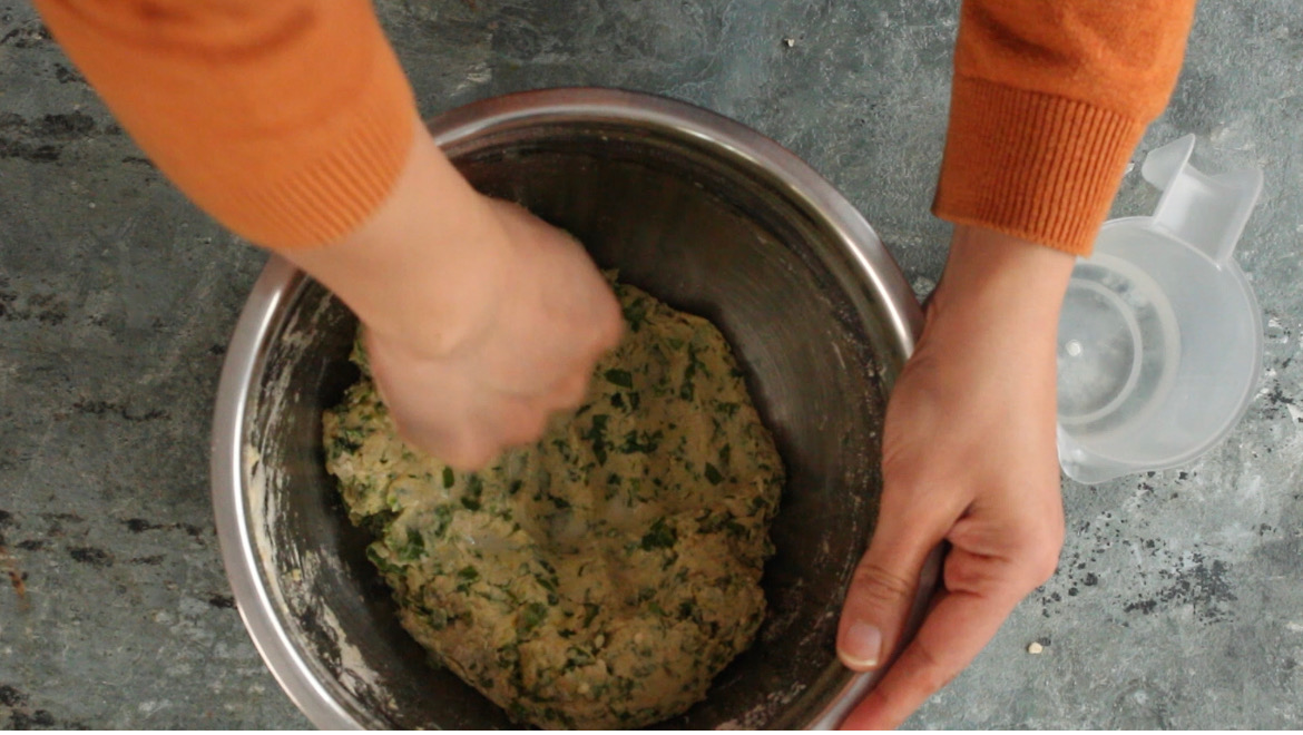 - Gradually add water, a tablespoon or two at a time and combine into the flour mixture. Once a ball is formed start kneading with fists. Knead for 3-4 minutes until smooth. Then cover and keep to rest for 15-20 minutes.