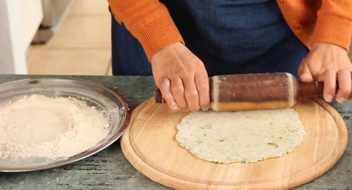 - Coat all over with dry flour and roll out using a rolling pin. Roll until evenly thin on all sides. Sprinkle some dry flour to assist with rolling.