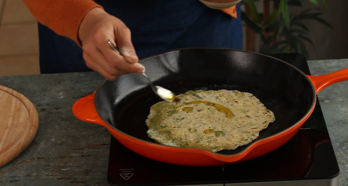 - Once you see small bubbles appearing on the surface, flip sides. Add a teaspoon of oil on the top and spread all over the paratha using the back of a spatula.
