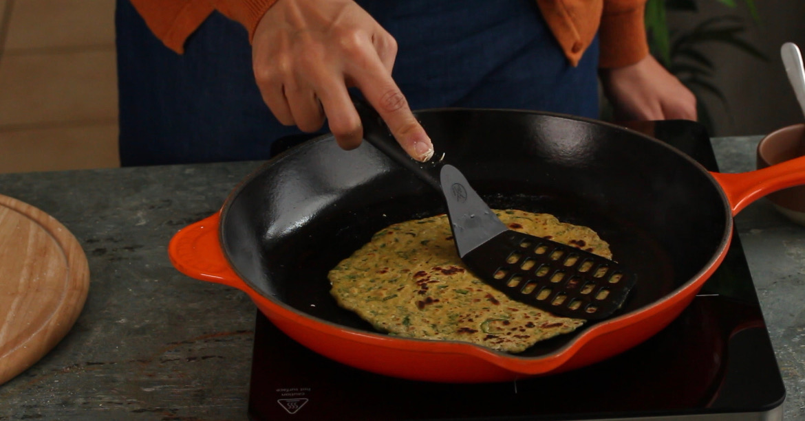 - Flip again and repeat on the other side as well. Gently press and rotate the paratha to cook it evenly on both sides. Once the paratha develops small brown spots all over, it’s cooked.