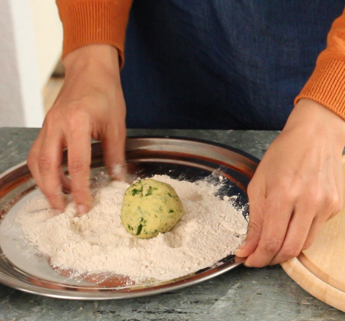 - After the dough has been rested, take a tennis ball sized dough portion and roll between your palms to make a smooth ball.