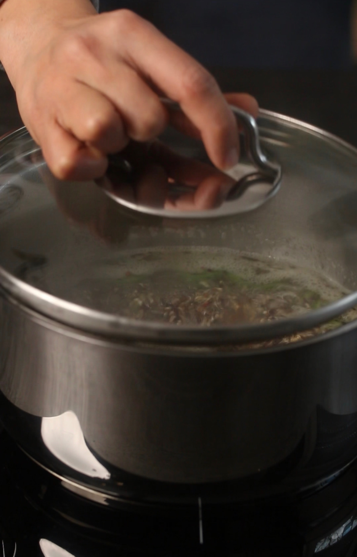 - Add the washed quinoa and mix. Lower the heat and put a lid on. Let cook for 20 minutes.