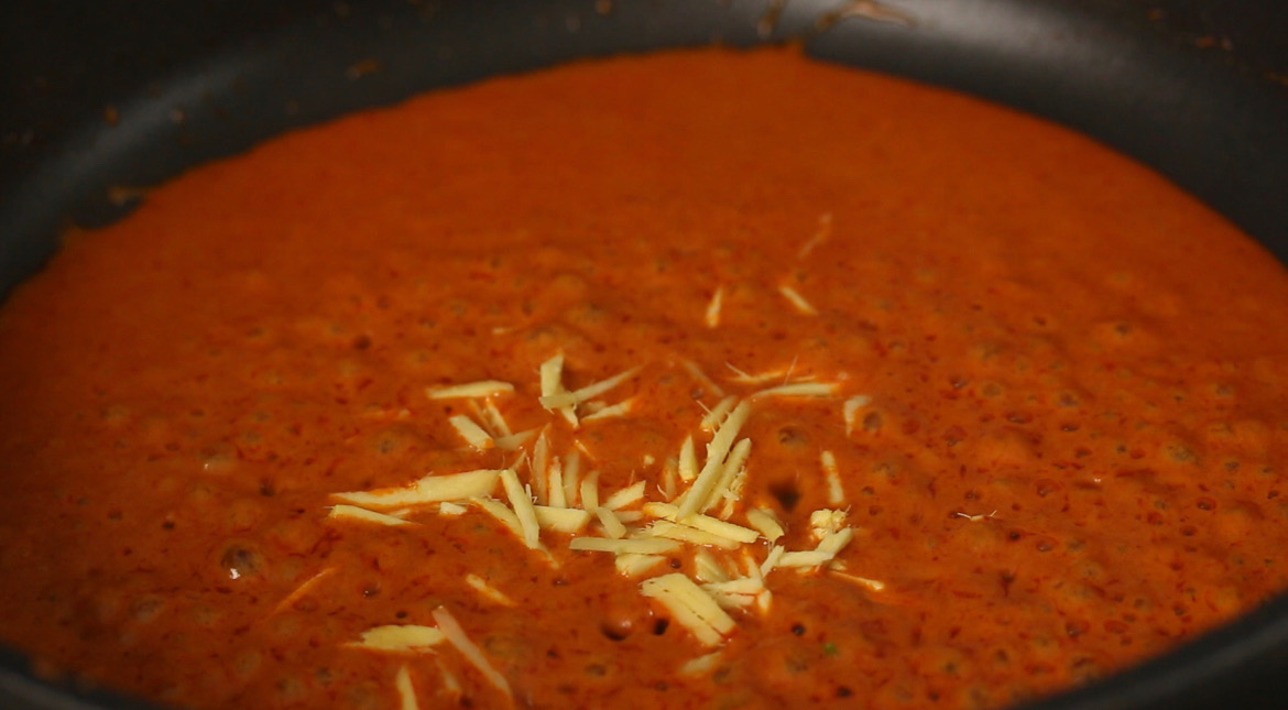 - Add the ginger juliennes into the pan and sauté for 2 minutes.