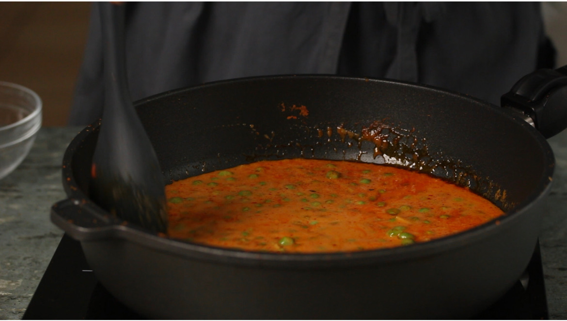 - Add the frozen/fresh peas and mix. Cover and cook on low heat for about 10 minutes or until the peas are tender.