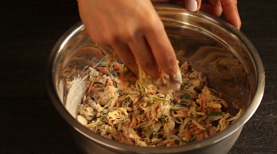 - Add the buckwheat flour, ground flaxseeds, turmeric powder and salt. Rub and mix the flour and spices into the veggies with hand.