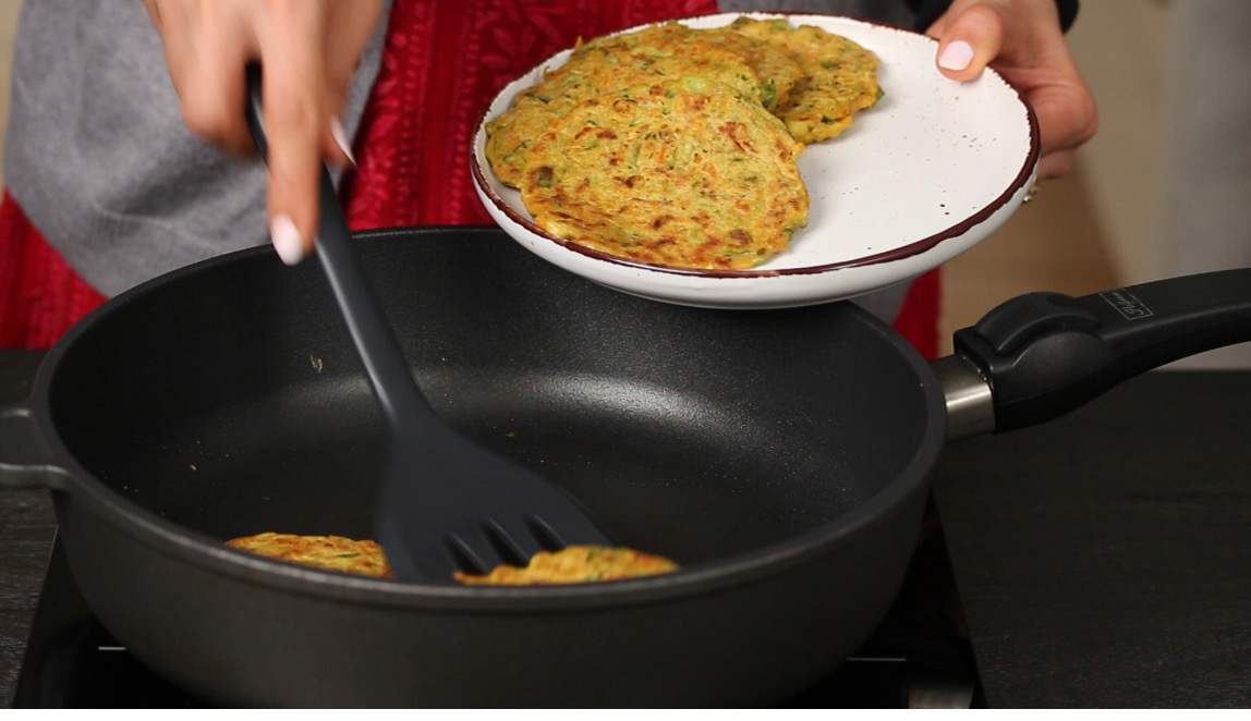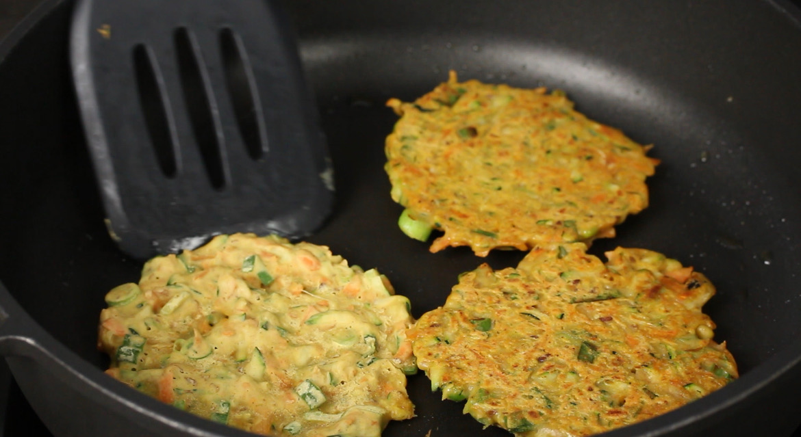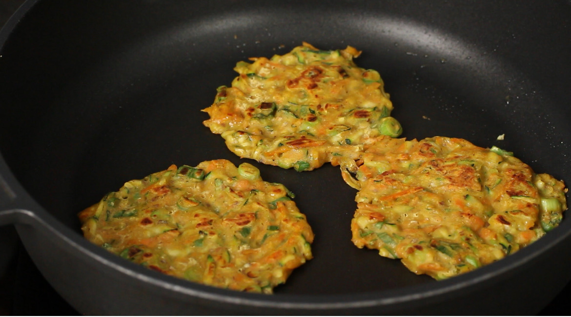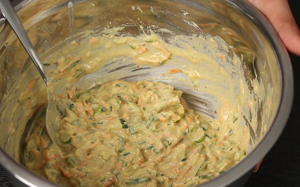 - Finely slice the spring onion. Grate the zucchini and carrot. Transfer the veggies to a big bowl.