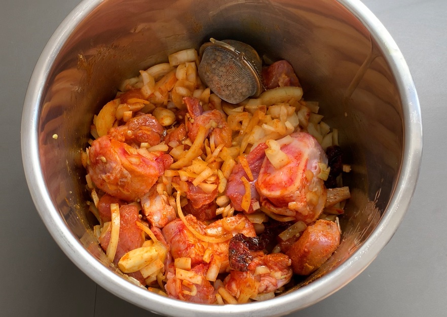 - Add the meat on the bottom of the cooker (not heated) followed by all the spices (including the sealed coriander and fennel), oil, garlic, onion and salt. Give everything a good mix.