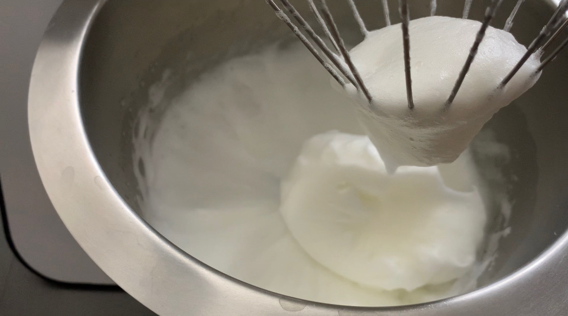 Add the egg whites and a pinch of salt into a mixing bowl. Beat until stiff peaks are formed. This will take between 3-4 minutes. A good way to check if the eggs are beaten enough is to invert the bowl and nothing should fall off. Transfer to another bowl and set aside.