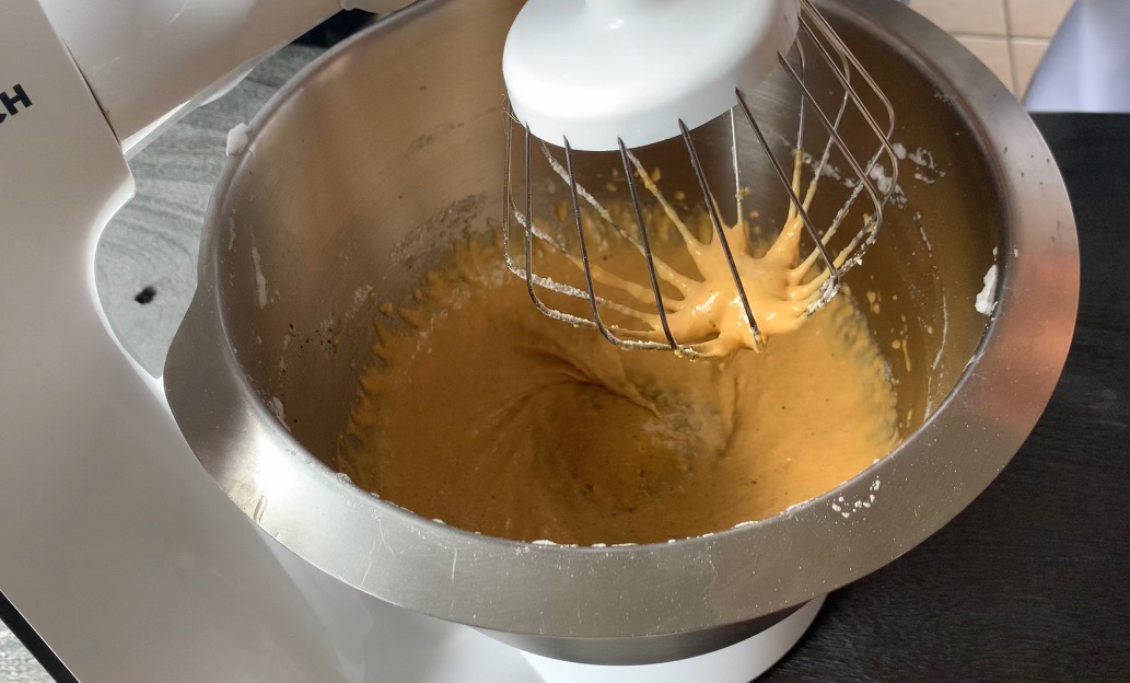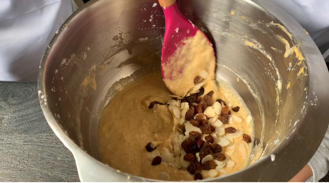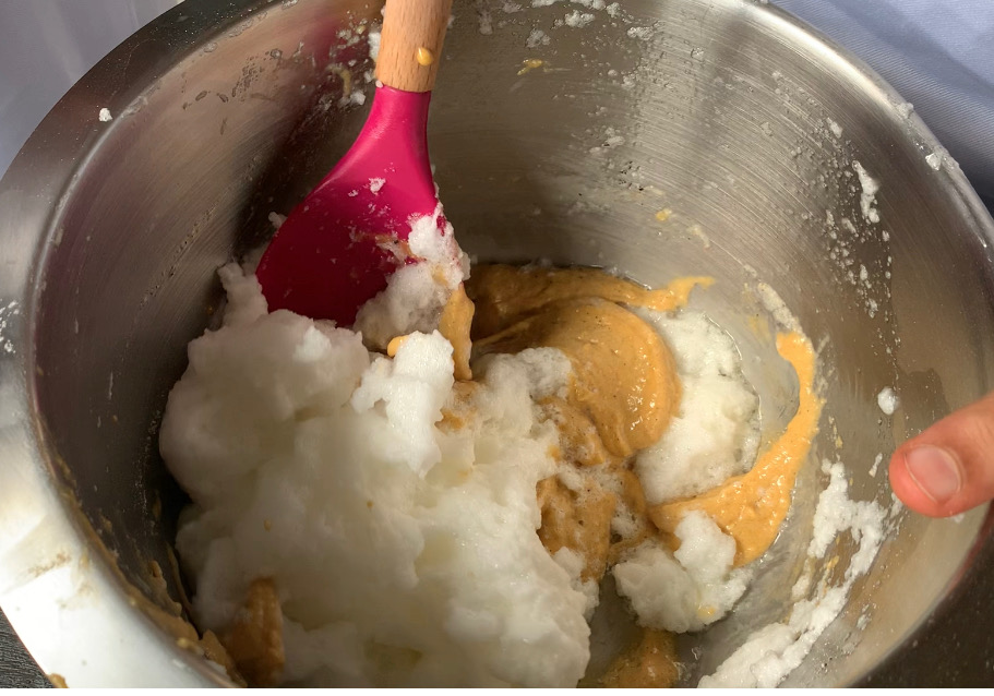 Add the beaten egg whites into the mixture and gently fold in. Be careful not to knock the air bubbles out to keep the batter fluffy.