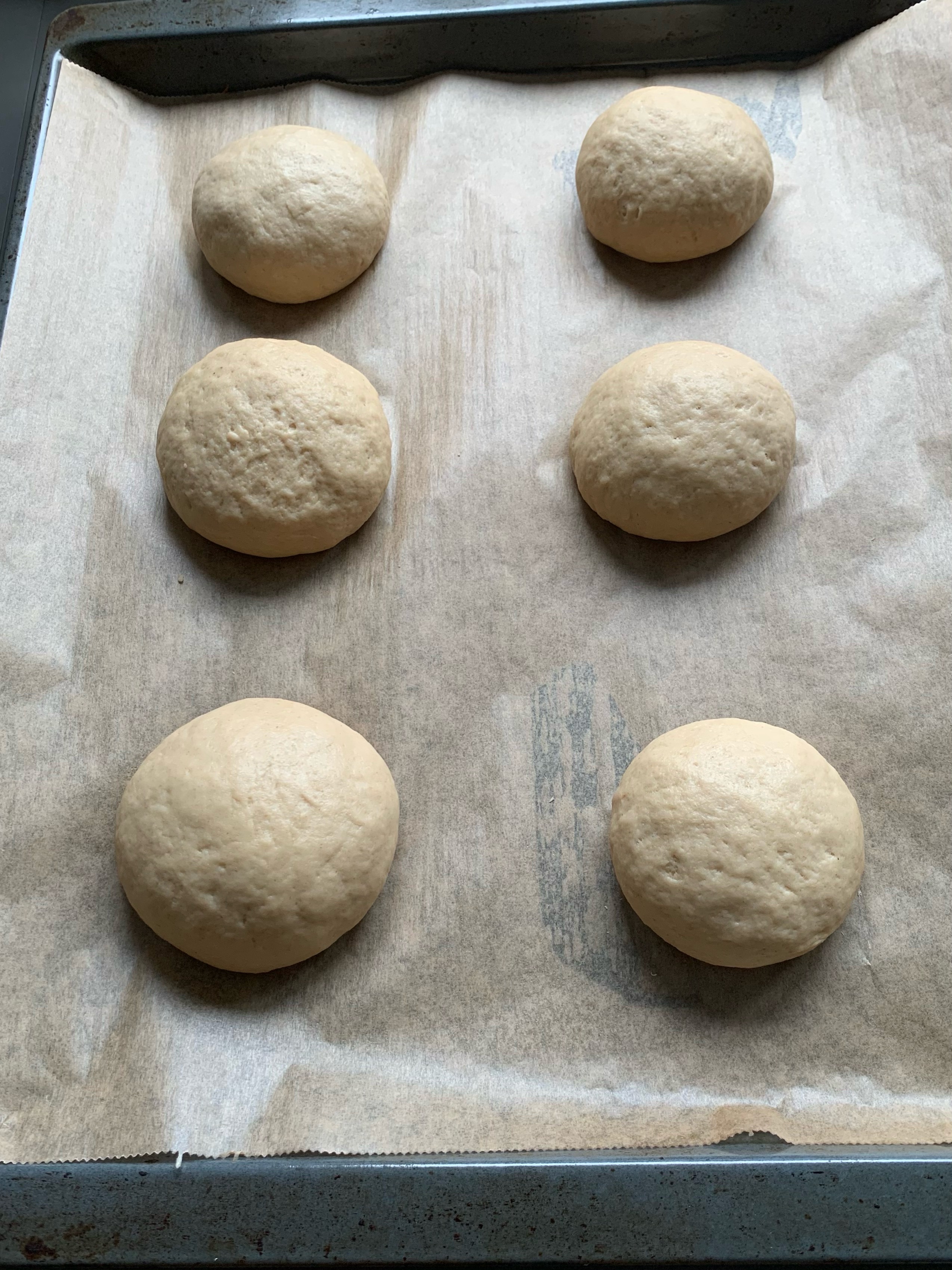 Form each part into a ball, sealing the edges underneath so there are no cracks on the top. Flatten slightly on the bottom to shape into buns.