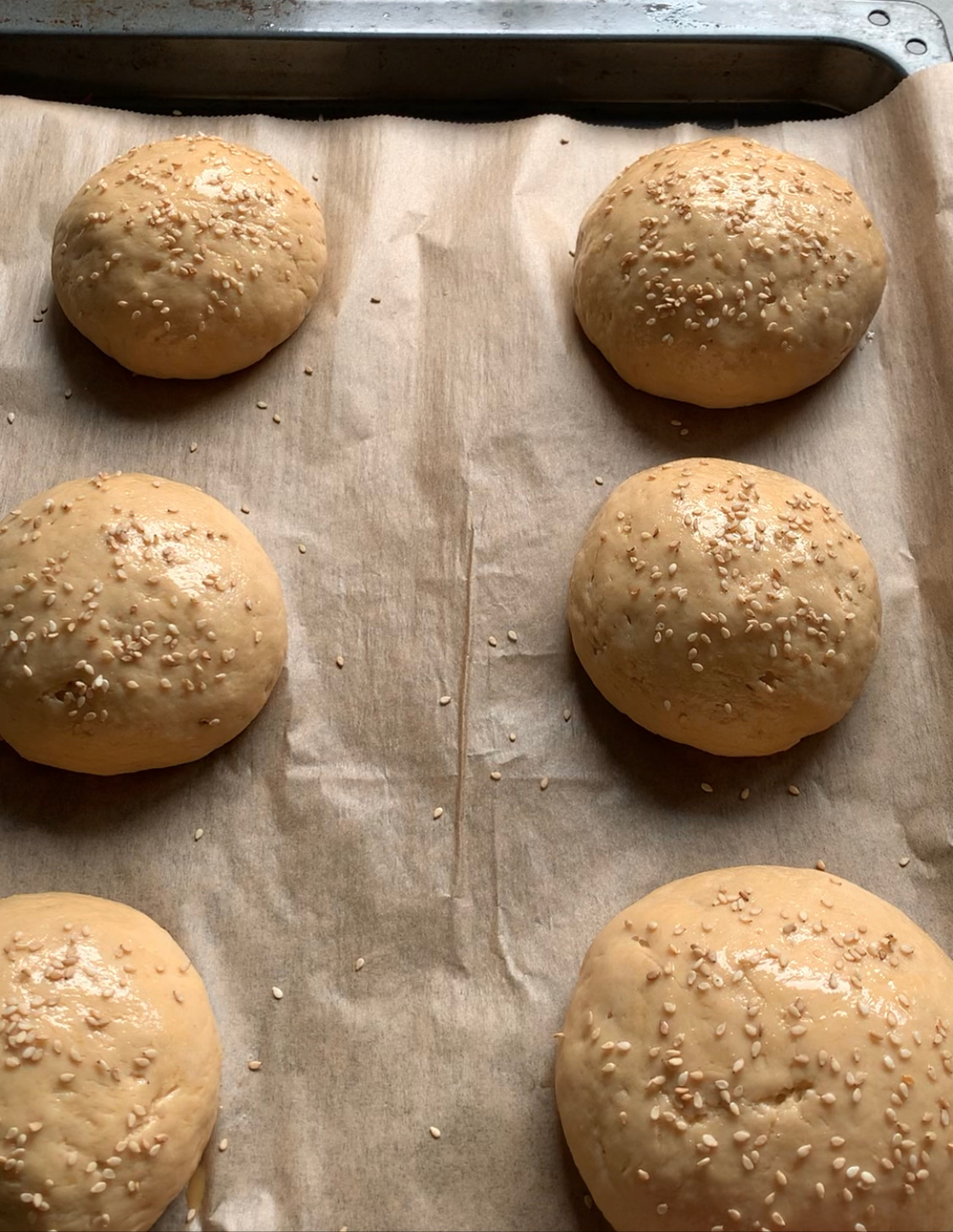 Using a brush, coat them lightly with the beaten egg and sprinkle some sesame seeds on top.
