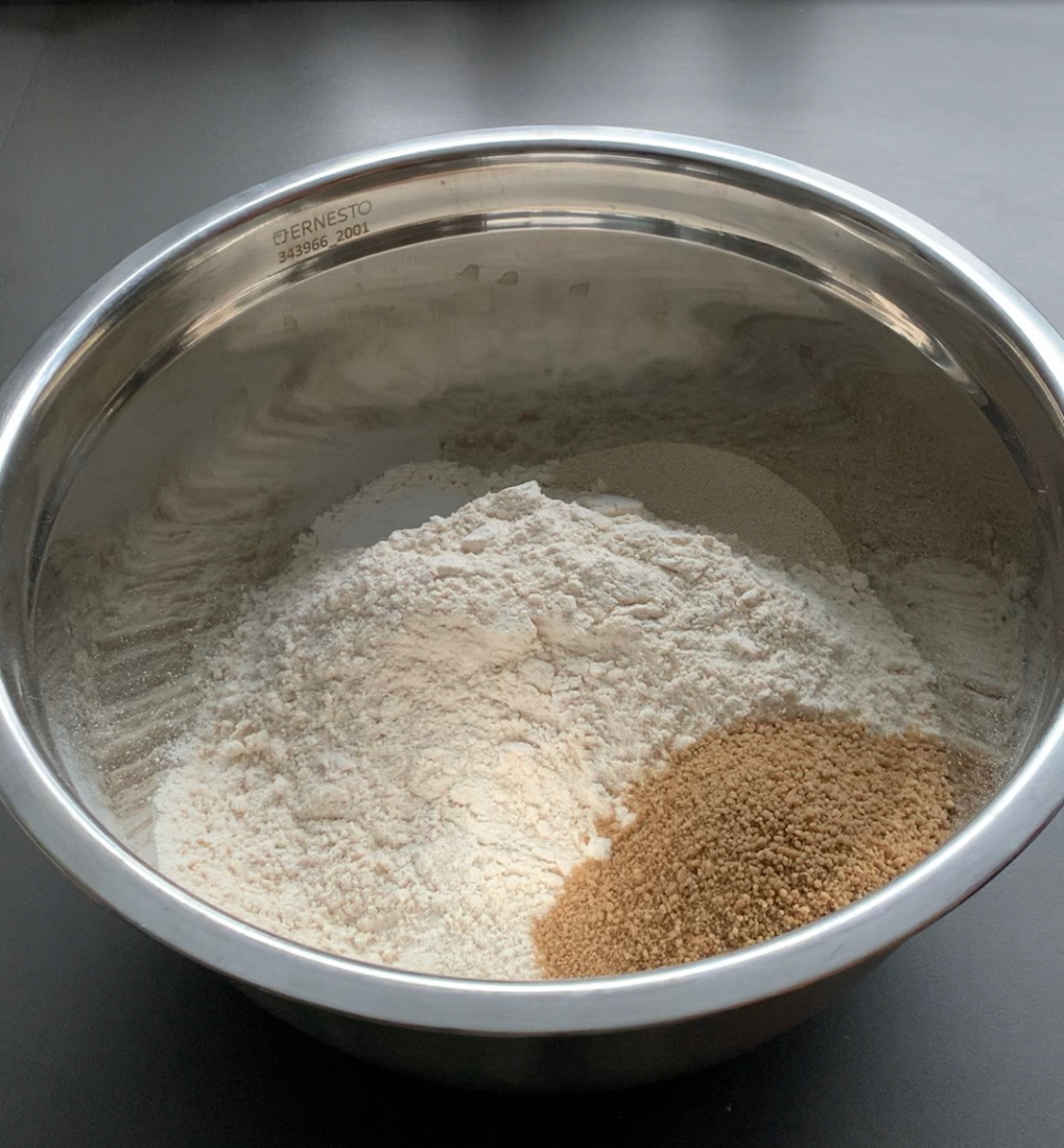 Take a big bowl and add whole-wheat flour, salt, sugar and yeast to it. Mix everything together with a spatula.